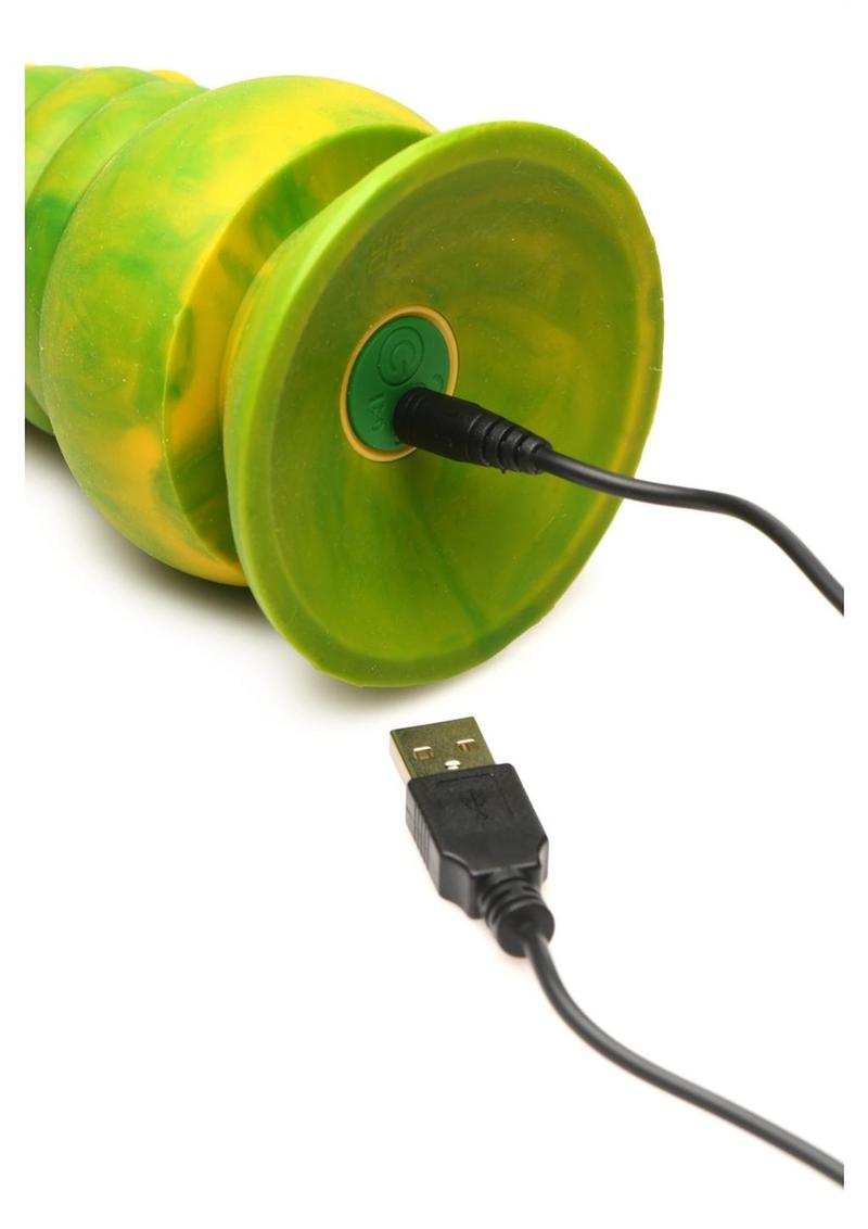 Enjoy your favorite Creature Cocks dildo with this vibrating Monstropus Tentacle! This yellow and green tentacle is massive and thick. The tapered tip helps with insertion, but from there on you can enjoy deep stretching as you fill yourself up with this firm yet squishy rod! Covered in suckers, this uniquely textured shaft stimulates you in new and spectacular ways! To add to the sensations, there's a powerful vibrator inside of the toy that packs 3 speeds and 7 patterns of vibration! Take this monster tentacle inside of you while enjoying the deep, powerful, rumbling vibrations! This toy is perfect for solo play and has a strong, suction-cup base for hands-free riding! Combine it with a compatible strap-on harness and enjoy some serious pegging fun! Indulge in any kinky cosplay, fantasy roleplay, or deviant desire, and rest easy knowing this rod is made out of premium, phthalate-free, body-safe silicone! Rated IPX6, it can be taken in the shower but cannot be submerged underwater. To recharge, use the USB cable provided. After play, wash with warm water and mild soap, then rinse and spray with a toy cleaner before patting dry. Use only with water-based lubricants for best results.